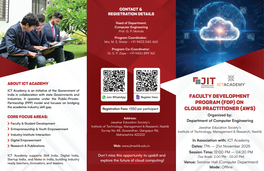 Faculty Development Program (FDP) on "Cloud Practitioner (AWS)" Organized by Department of Computer Engineering in Association with ICT Academy Between 17/11/2025 to 21/11/2025. Click here for registration